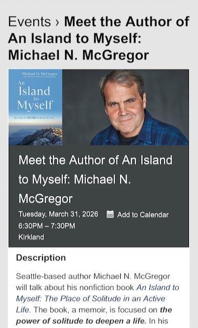 Come out to the Kirkland Library (308 Kirkland Avenue) on Tuesday, March 31, for a discussion of my latest book An Island to Myself: The Place of Solitude in an Active Life.